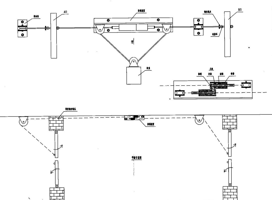 機(jī)械閉鎖裝置是怎么工作的呢?機(jī)械閉鎖裝置主要是用于兩道無(wú)壓風(fēng)門的,當(dāng)A門開啟時(shí)帶動(dòng)鋼絲繩移動(dòng),固定在鋼絲繩上的定軸隨之移動(dòng),彈簧伸長(zhǎng)將動(dòng)軸頂起,動(dòng)軸將軸銷推到另一側(cè),軸銷將與B門相連的鋼絲繩上的定軸固定,B門不能開啟。當(dāng)A門關(guān)閉時(shí),配重帶動(dòng)鋼絲繩向回移動(dòng),定軸將動(dòng)軸壓回原位,軸銷可以移動(dòng),B門解鎖。同理,B門開啟時(shí),A門也不能開啟。
